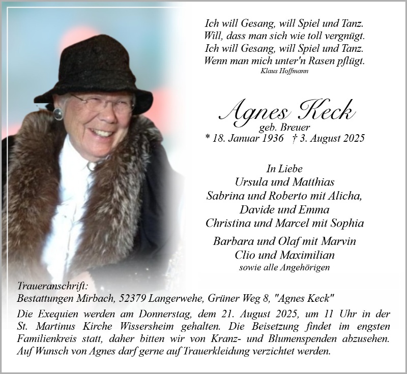 Der Verlust von Agnes ist unfassbar schmerzlich. Ich werde Agnes, wie auch bereits Willi, mit Humor und tiefstem Respekt in Erinnerung behalten.