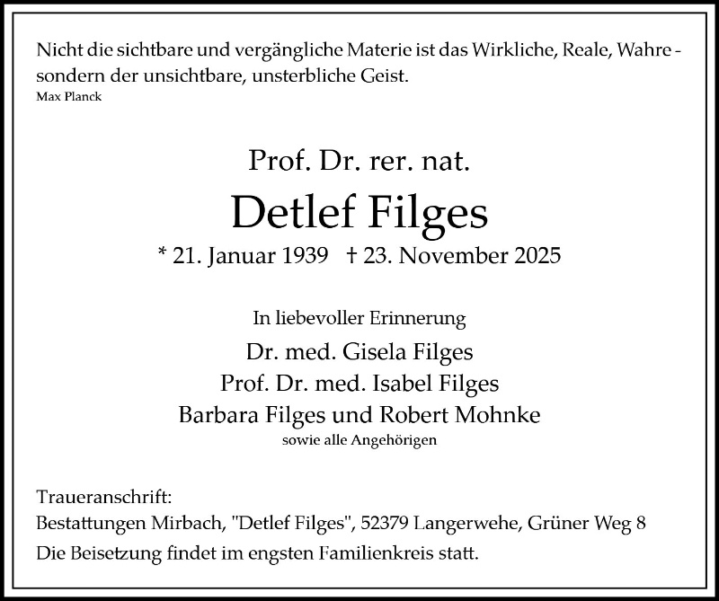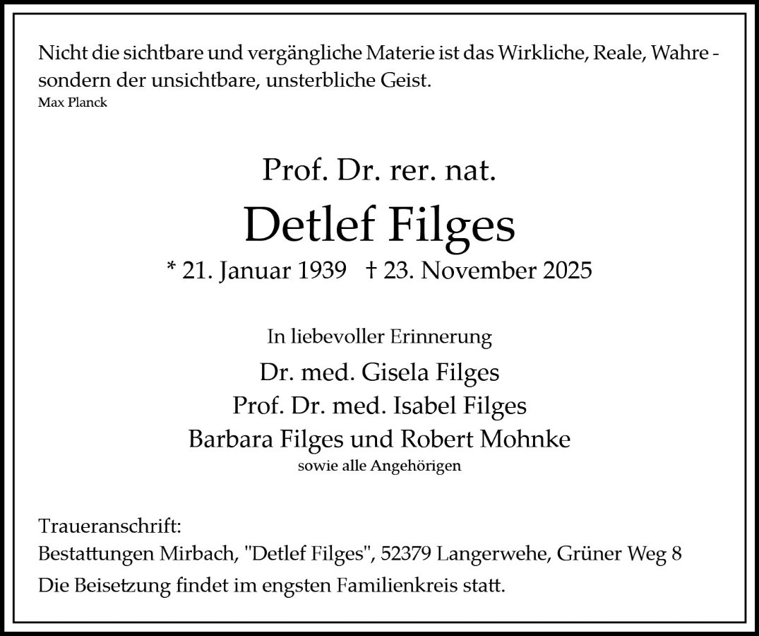 mit Betroffenheit habe ich die Todesnachricht von Ihrem Mann - Detlef Filges - zur Kenntnis genommen. Herr Filges ist mir während unserer gemeinsamen Zeit im Institut für Kernphysik des Forschungszentrums Jülich - er war Wissenschaftler im IKP-1 und ich selbst habe das IKP-2 geleitet - als überaus freundlichen, verläßlichen und wissenschaftlich hoch abgesehenen Kollegen kennen- und schätzen gelernt: so werde ich ihn in Erinnerung behalten, auch wenn wir uns nach seinem Ausscheiden aus dem Institut nur noch selten gesehen haben.