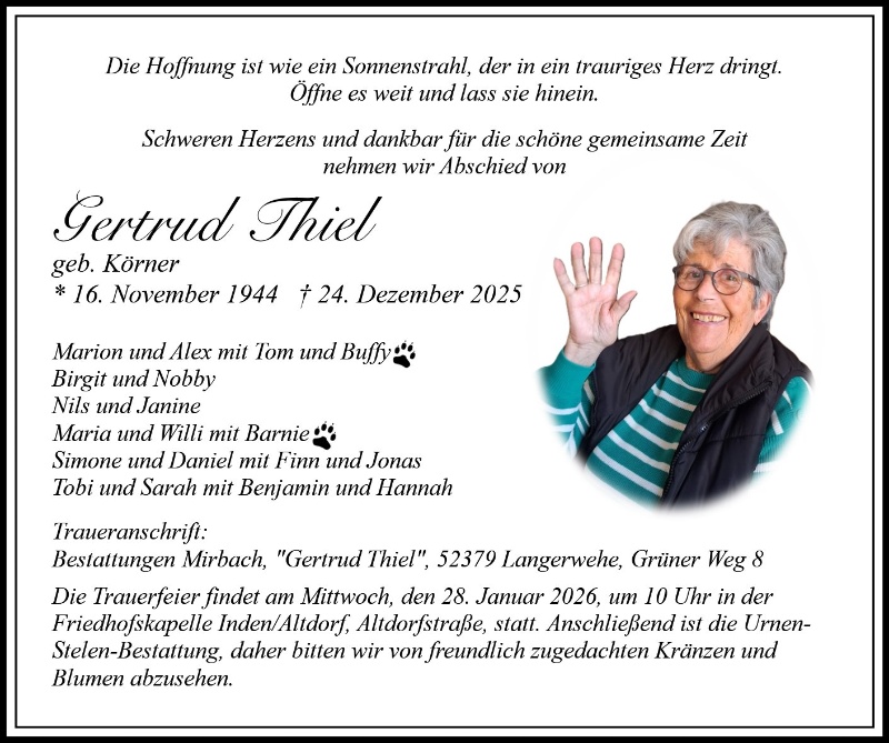 Trauer kann man nicht sehen, nicht hören, kann sie nur fühlen. Sie ist ein Nebel, ohne Umrisse. Man möchte diesen Nebel packen und fortschieben, aber die Hand fasst ins Leere. Wir wünschen Ihnen, dass diese Gedenkseite Orientierung und Licht im Nebel der Trauer bietet, zu dem viele beitragen werden.