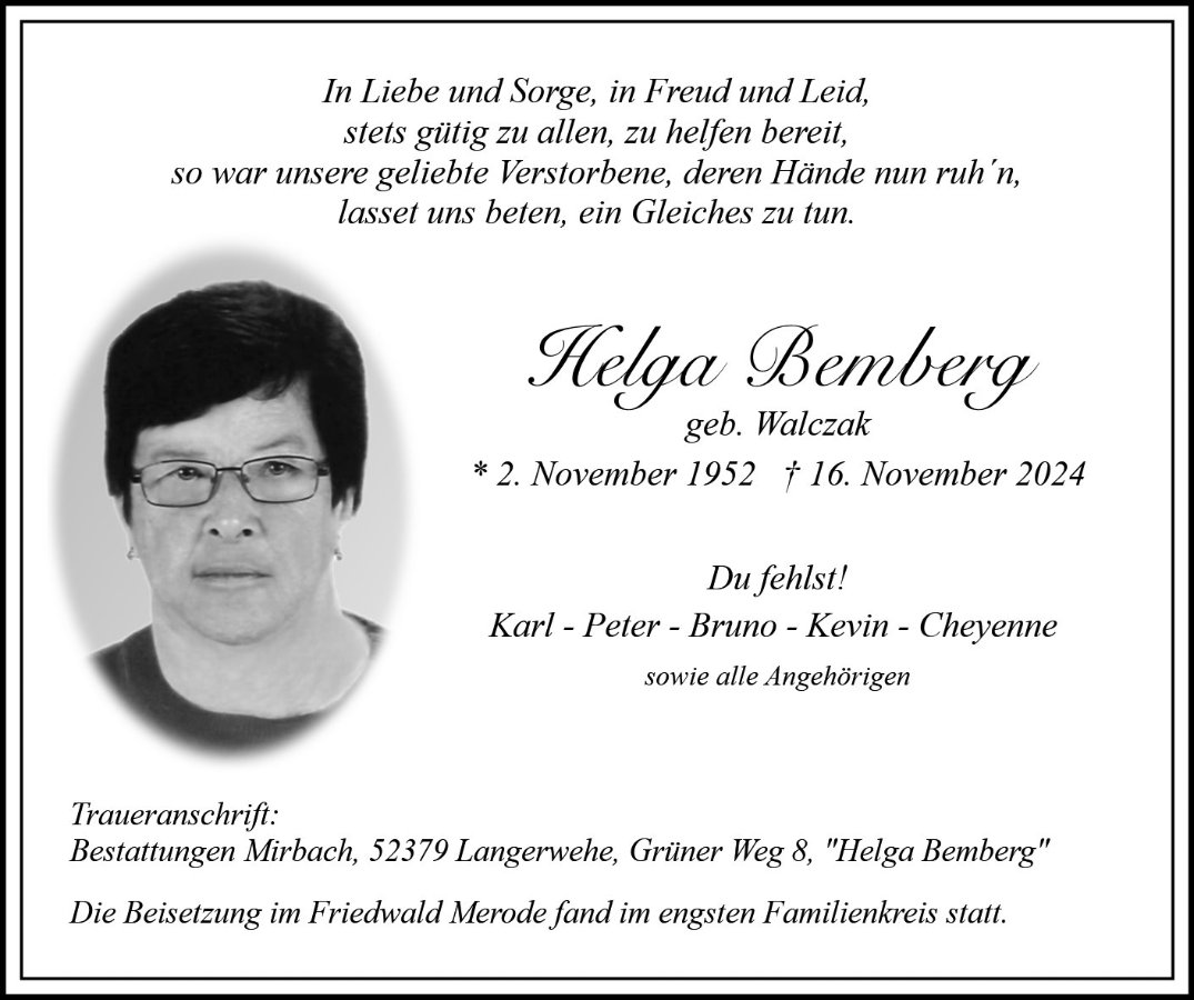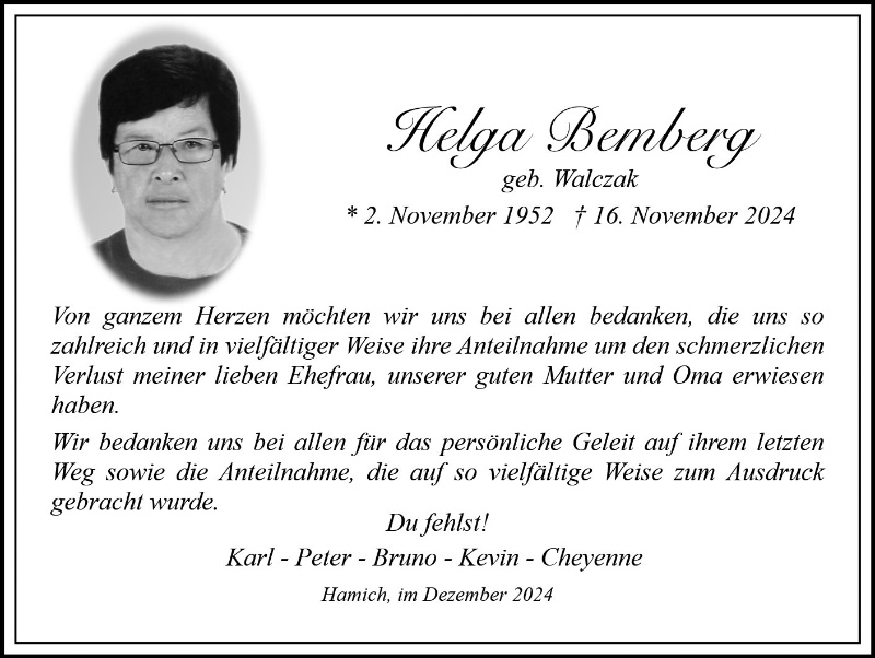 der Tod deiner lieben Frau Helga hat mich betroffen gemacht. Mir war nicht bekannt, dass sie so schwer erkrankt war. Helga war eine liebenswürdige Mitarbeiterin bei der Tafel. Sie hat sich mit ihrem Einsatz für die Armen um das Allgemeinwohl verdient gemacht. Ich werde ihr immer ein ehrendes Andenken bewahren. Mein Mitgefühl gilt allen, die der Tod Helgas mit Trauer erfüllt. Ich wünsche dir Kraft in dieser für dich schweren Zeit.