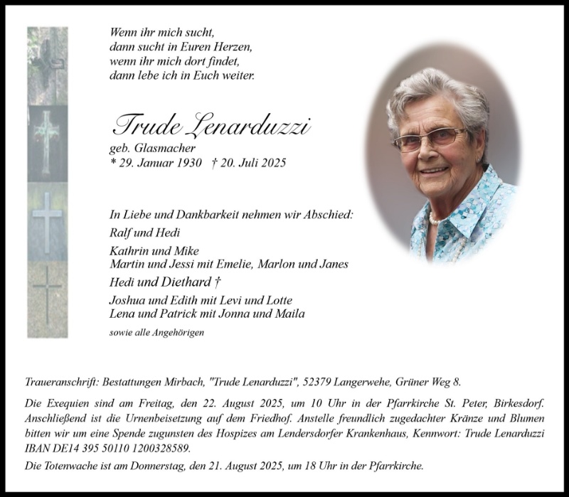 Der Tod ist unendlich aber wir können Menschen durch unsere Erinnerungen am Leben erhalten. Wir können uns an schöne Zeiten erinnern, an ein Lachen oder an eine bestimmte Geste. Erinnerungen die hier auf dieser Gedenkseite zusammen getragen werden, helfen Ihnen dabei Ihre Trauer leichter zu tragen.
